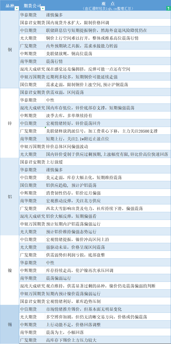汇通财经APP讯——期货公司观点汇总一张图:12月19日有色系(铜、锌、铝、镍、锡等)