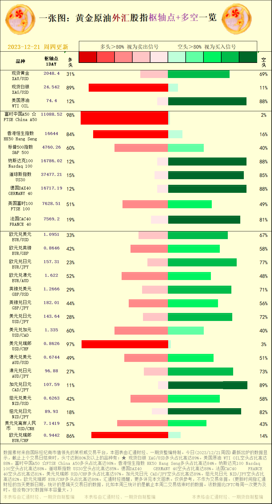 标题:一张图:2023/12/21黄金原油外汇股指"枢纽点+多空占比"一览