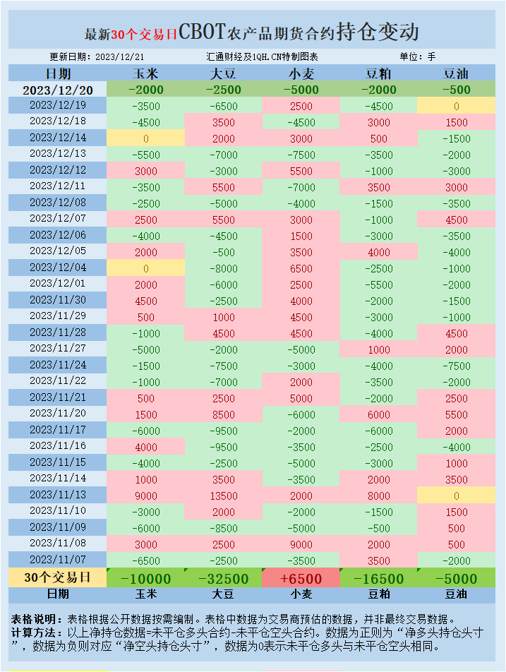 交易商估算的结果显示,大宗商品基金本周三(12月20日)增加小麦、玉米、大豆、豆油、豆粕投机性净空头头寸。最新30个交易日,大宗商品基金增加豆油、玉米、豆粕、大豆、投机性净空头头寸,增加小麦投机性净多头头寸。