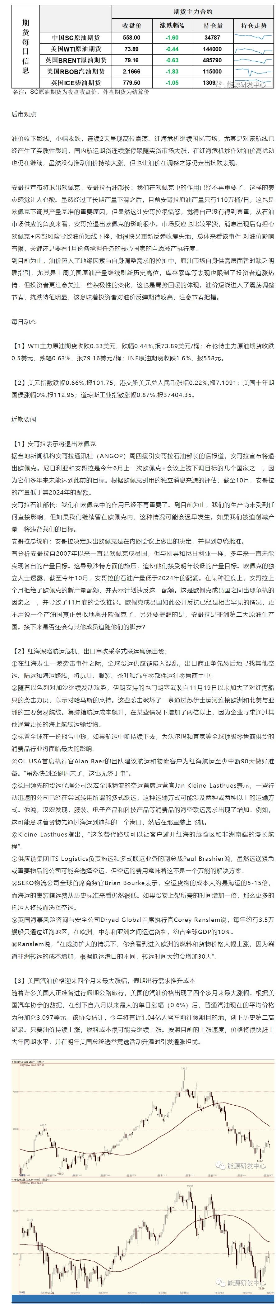 汇通财经APP讯——油价收下影线,小幅收跌,连续2天呈现高位震荡。红海危机继续困扰市场,尤其是对该航线已经产生了实质性影响,国内航运期货连续涨停跟随实货市场大涨,在红海危机炒作对油价高扰动也仍在继续,虽然没有推动油价持续大涨,但也让油价在调整之际仍走出抗跌表现。