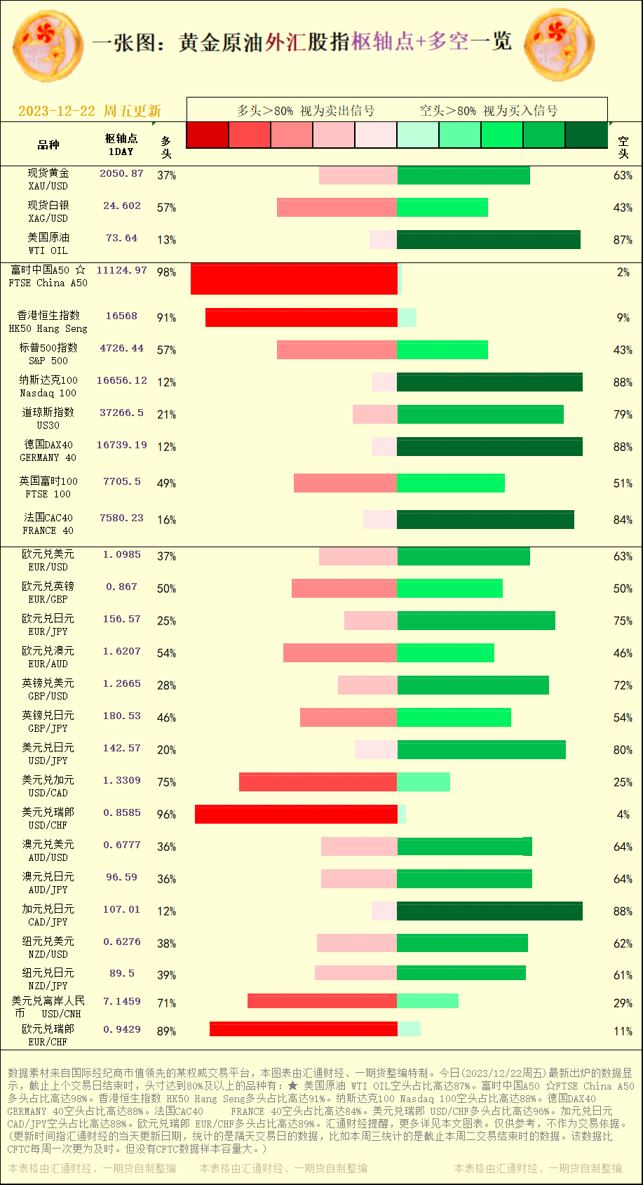 标题:一张图:2023/12/22黄金原油外汇股指"枢纽点+多空占比"一览