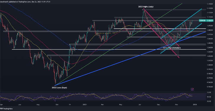 随着美国国债收益率偏下行以及华尔街充分展现市场繁荣,美元可能会加深近期回调。这可能会导致黄金、欧元/美元和英镑/美元在2024年之前进一步上涨。但投资者仍需谨慎,因为某些市场已接近潜在的超买水平。