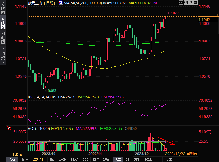欧元主力价格走高,但成交量在持续缩减,圣诞节日来临前夕交投变清淡,需关注背离风险。