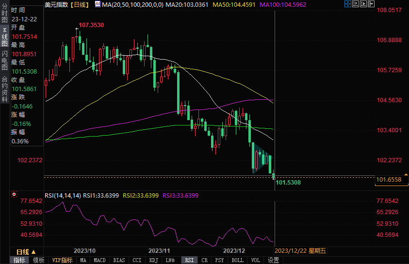 北京时间周五晚上22:30,美国11月核心个人消费支出数据公布,这是圣诞休市前的最后一个重量级数据。美国核心个人消费支出年率从3.5%降至3.2%,稍低于预期0.1%,利空美元。不过,加拿大10月季调后GDP数据不及预期支撑了美元。美元指数小幅走高后回落。