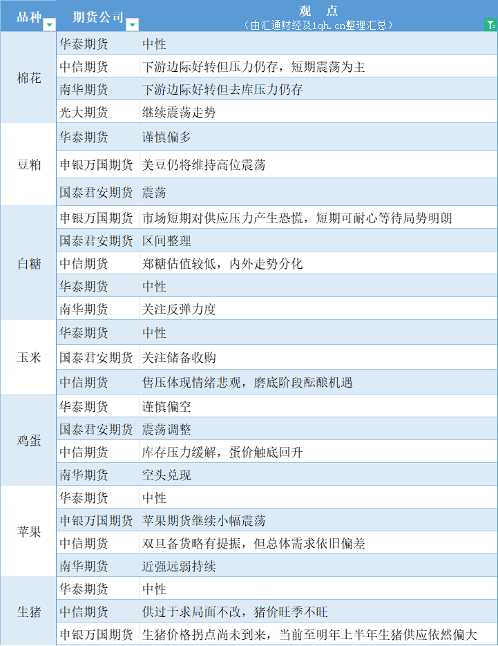 汇通财经APP讯——期货公司观点汇总一张图:12月25日农产品(棉花、豆粕、白糖、玉米、鸡蛋、生猪等)