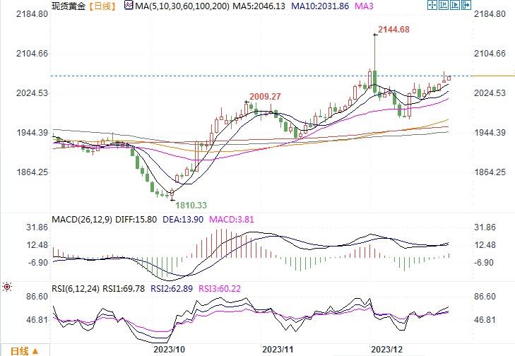 上周五,因美联储最青睐的通胀数据逊于预期,巩固市场对美联储在明年3月降息的预期,美元指数上周五(12月22日)触及近五个月低点,现货黄金价格则一度升至2070美元/盎司上方的多周新高。过去一周,在美联储主席鲍威尔于此前的新闻发布会上“放鸽”之后,多名美联储官员迅速出场灭火,重申2%通胀目标不变,试图缓和市场预期。但是,包括高盛、摩根大通在内纷纷预测明年美联储将降息至少5次。美联储官员们打压降息预测的效果非常有限。 EdwardJones高级投资策略师AngeloKourkafas表示,“人们将继续认为美联储将转向鸽派。这为市场和市场人气提供了支撑,这一点预计本周不太可能改变。”此外,据巴勒斯坦电视台24日报道,以色列军队当晚对加沙地带中部的迈加齐难民营发动空袭,造成至少70名巴勒斯坦人死亡。报道说,以军空袭地点位于迈加齐难民营人口密集区,死者多数为妇女和儿童,伤亡人数可能会继续上升。巴以冲突的持续升级,也将在一定程度给到黄金避险买盘理由。