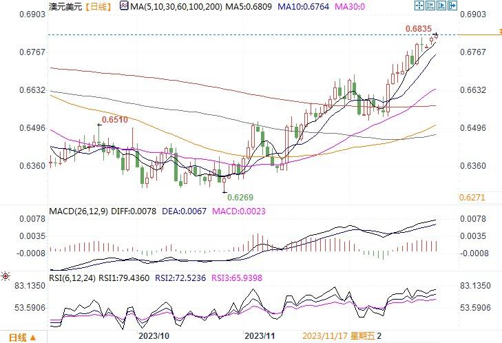 周二(12月26日),澳元/美元较上周五收盘上涨0.38%,此前曾创下五个月高位0.6826。周二澳洲、香港和英国等主要市场仍在假日中,澳元在平淡的市场中主要受益于美元的继续滑落而走高。至于美元,因对美联储降息的预期削弱了美元相对于其他货币的吸引力。许多分析师预计,2024年美国经济将明显放缓,但预计美联储也会采取行动,确保联邦基金利率与已实现通胀率之间的差距不会扩大太多。如果通胀率下降的速度远快于美联储的指标利率,那么货币条件收紧的程度就会超过美联储决策者的预期,并增加经济硬着陆的风险。因此,Action Economics的分析师在周二的一份报告中指出:“通胀应该会继续降温,这将使决策者有能力在6月之前降息,以防止实际利率被动收紧。”美元利率明年转降预期的升温,相比而言似乎利好澳元,因为澳联储明年降息的预期并不如美联储那般强烈。息差因素以及市场上风险偏好情绪的逐步改善,或可支持澳元继续回升。日线图上,澳元/美元继续沿布林带通道上轨线上行,各项技术指标保持上顷,显示澳元多头保持着优势。只有跌落0.67之下,升势或才有可能逆转。