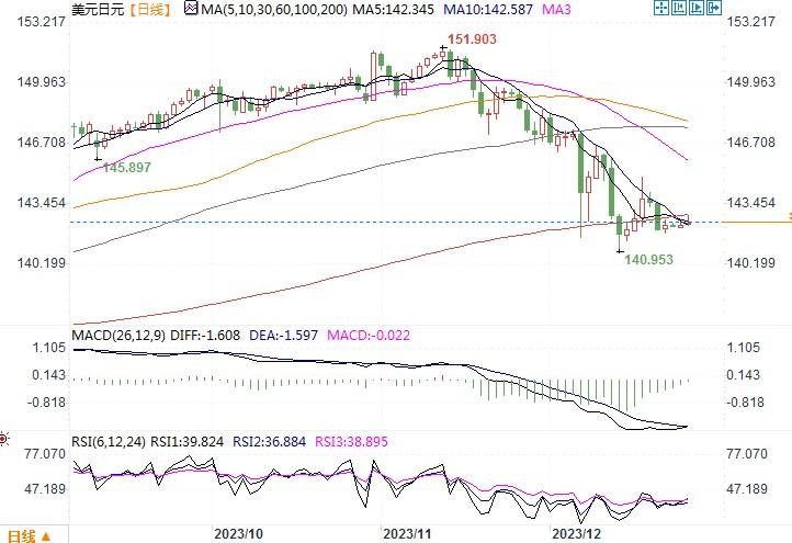 周二(12月26日),圣诞节后回来的第一个交易日,美元指数日内下跌0.18%,报101.44,美元兑日元盘中基本维持在142.47附近,波幅极窄。外汇市场上,对美联储降息的预期削弱了美元相对于其他货币的吸引力。得益于此,日元近期也是在最近触及的五个月峰值附近企稳。日本央行总裁植田和男周一表示,实现央行通胀目标的可能性正在“逐步上升”,如果可持续实现2%目标的前景“充分”增强,央行将考虑改变政策。日本央行总裁近期多番在货币政策上发表了鹰派的讲话,促进了市场对于日元将会结束负利率时代的猜想,因此日元前期也是受到这种预期的推动而回升。后续若美元继续下落,且日元升息预期热度不减,那么日元则有望延续其回升之旅。但若迟迟只听雷声,不见雨下,日元有可能返弱。日线图上,美元/日元短线进入调整走势模式,下方142似乎暂时给到较强的支撑。若波动变剧烈,其波动的区间料主要集中于141-145之间。