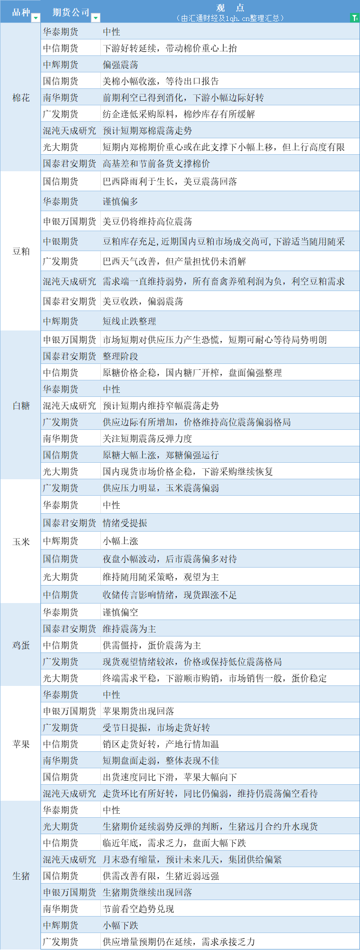 汇通财经APP讯——期货公司观点汇总一张图:12月29日农产品(棉花、豆粕、白糖、玉米、鸡蛋、生猪等)