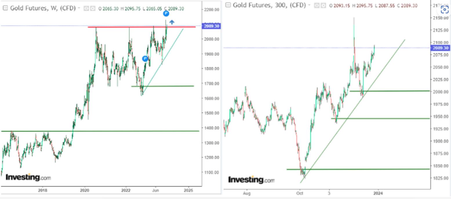 黄金需求激增可以归因于中东地缘政治紧张局势,以及对美联储将在即将到来的一年放缓其紧缩货币政策的期望。这一转变标志着降息周期的开始,预计将削弱美元,并导致美国国债收益率下降。