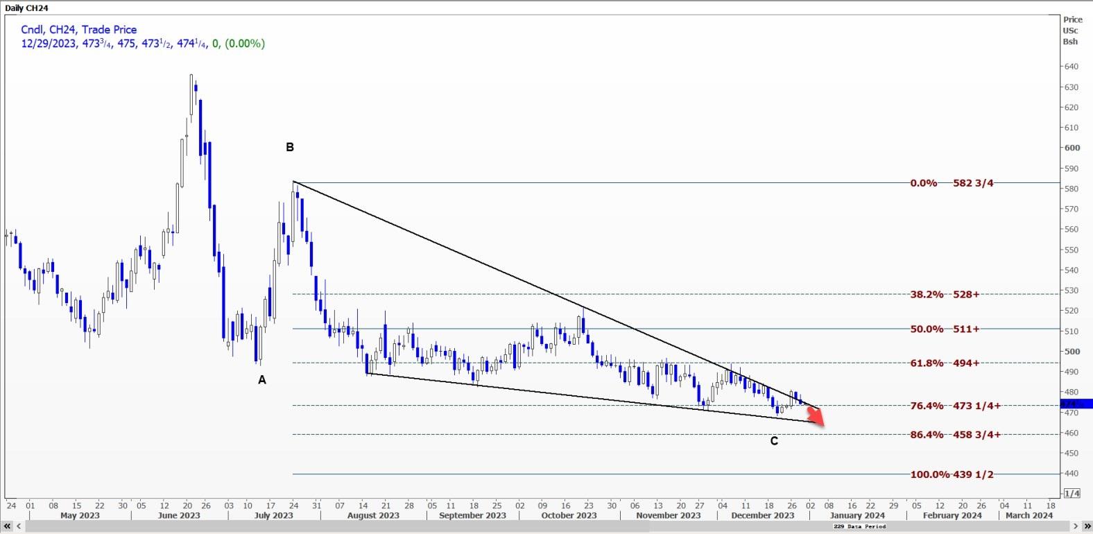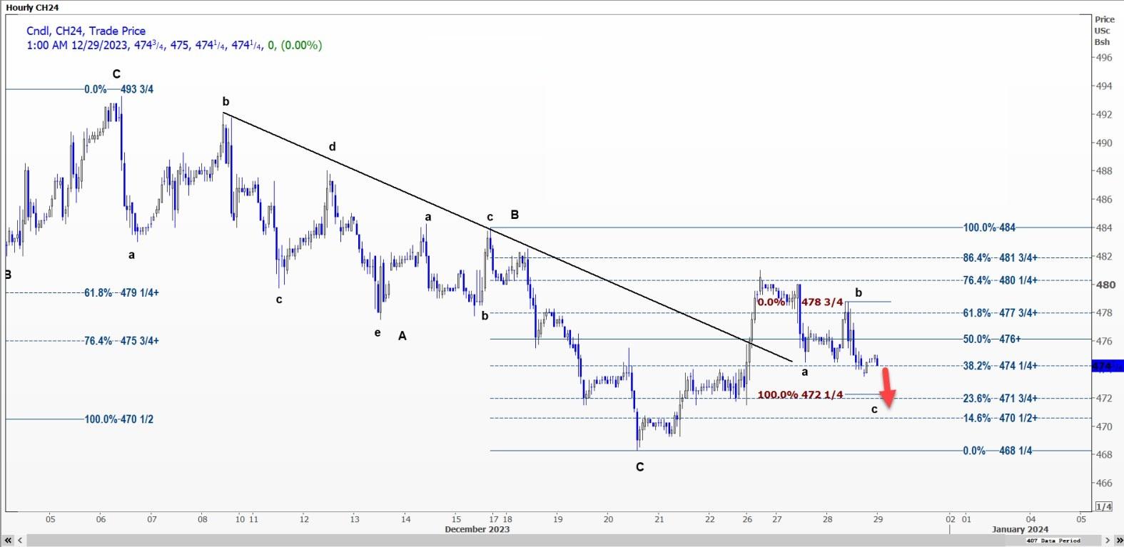 受c波推动,CBOT 3月玉米CH24可能跌至每蒲式耳4.7050至4.7175美元的区间。