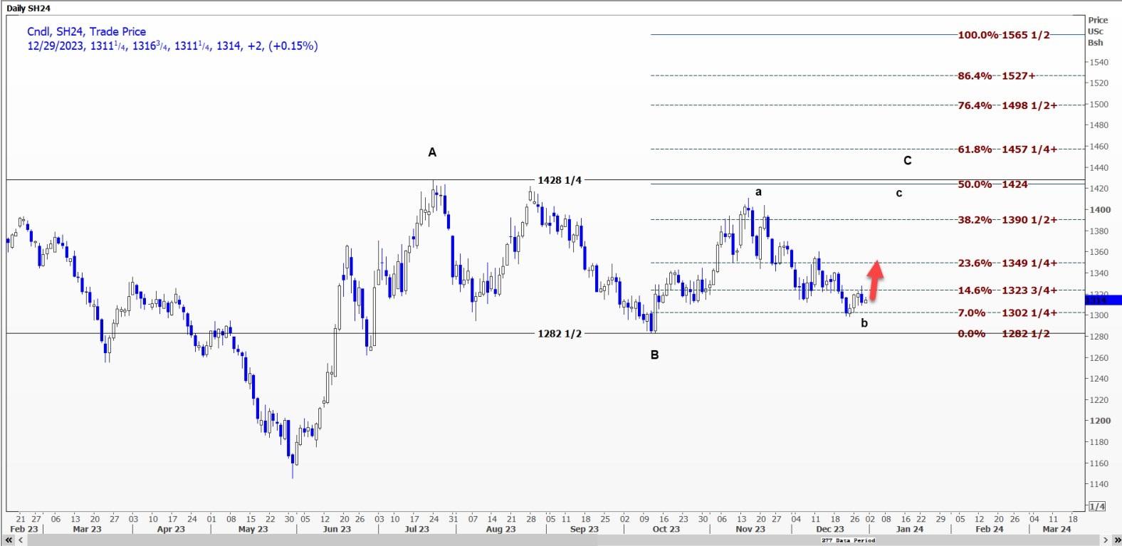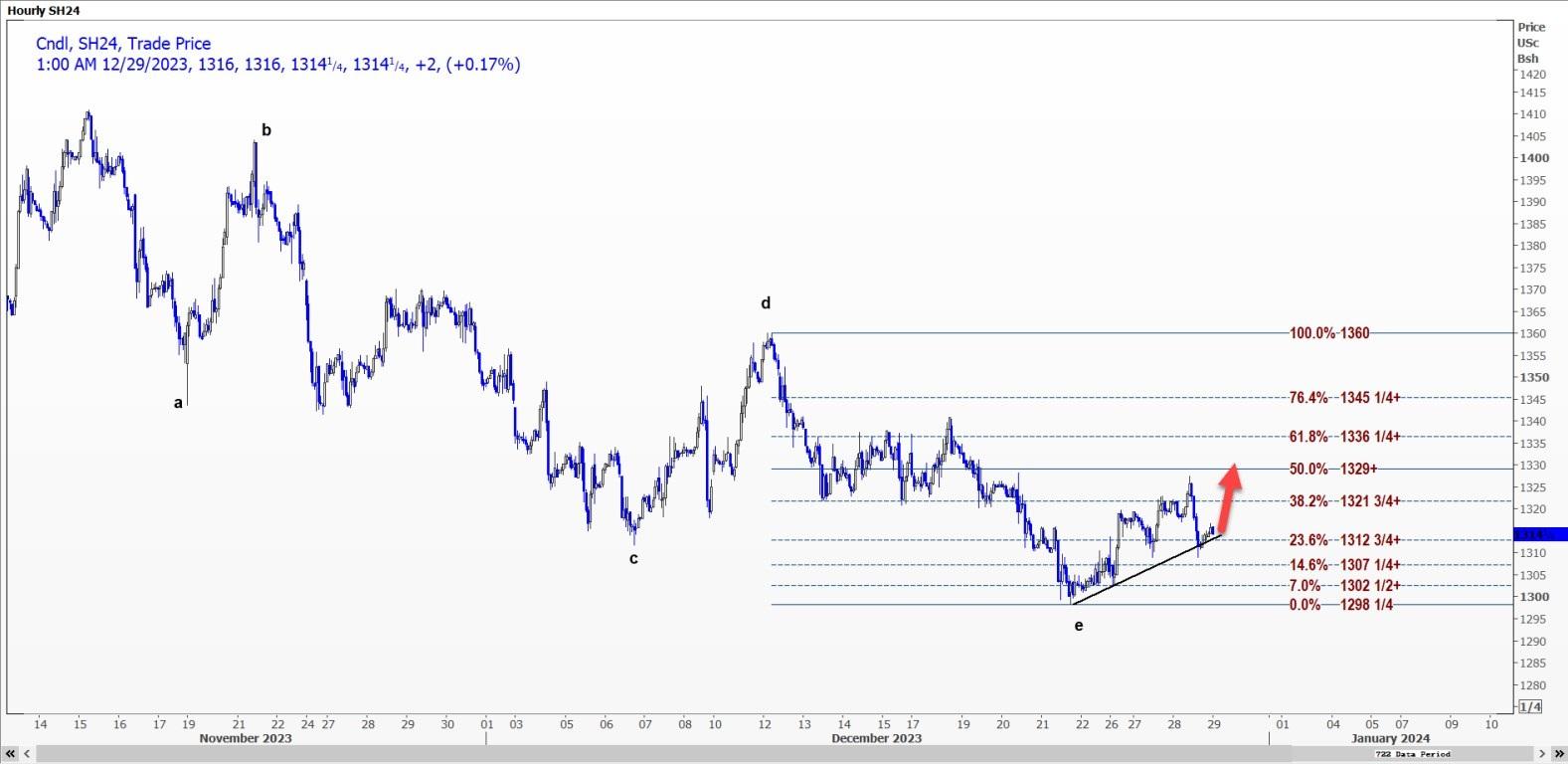 CBOT大豆3月合约SH24可能会重新测试每蒲式耳13.2175美元的阻力位,突破该阻力位可能会打开通往13.29-13.3625美元区间的道路。
