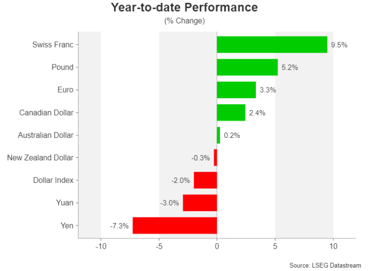 因此,尽管美元在夏季和秋季出现强劲反弹,但美元兑一篮子货币在年底时似乎仍将下跌近3%。此次反弹是由美国国债收益率飙升推动的,而美国国债收益率此后因对未来一年大幅降息的预期升温而受到损害。