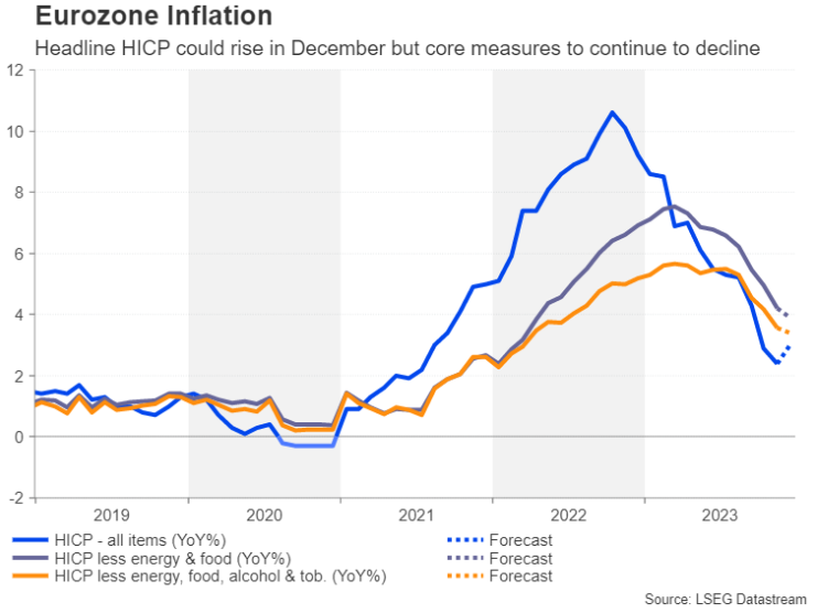 与美联储不同的是,欧洲央行在确定通胀确实朝着2%迈进之前,对于发出任何转向信号都持谨慎态度。周五公布的12月份CPI初值可能会证明这种谨慎态度是合理的。预计12 月份总体 CPI将从同比2.4%加速至3.0%,这表明通胀持续稳定在2%目标附近仍有很长的路要走。