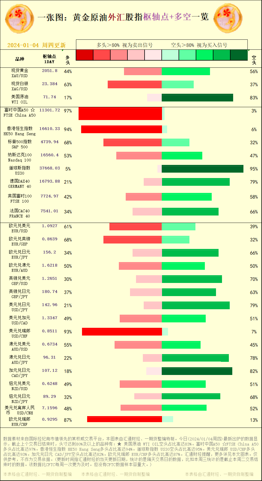 标题:一张图:2024/01/04黄金原油外汇股指"枢纽点+多空占比"一览