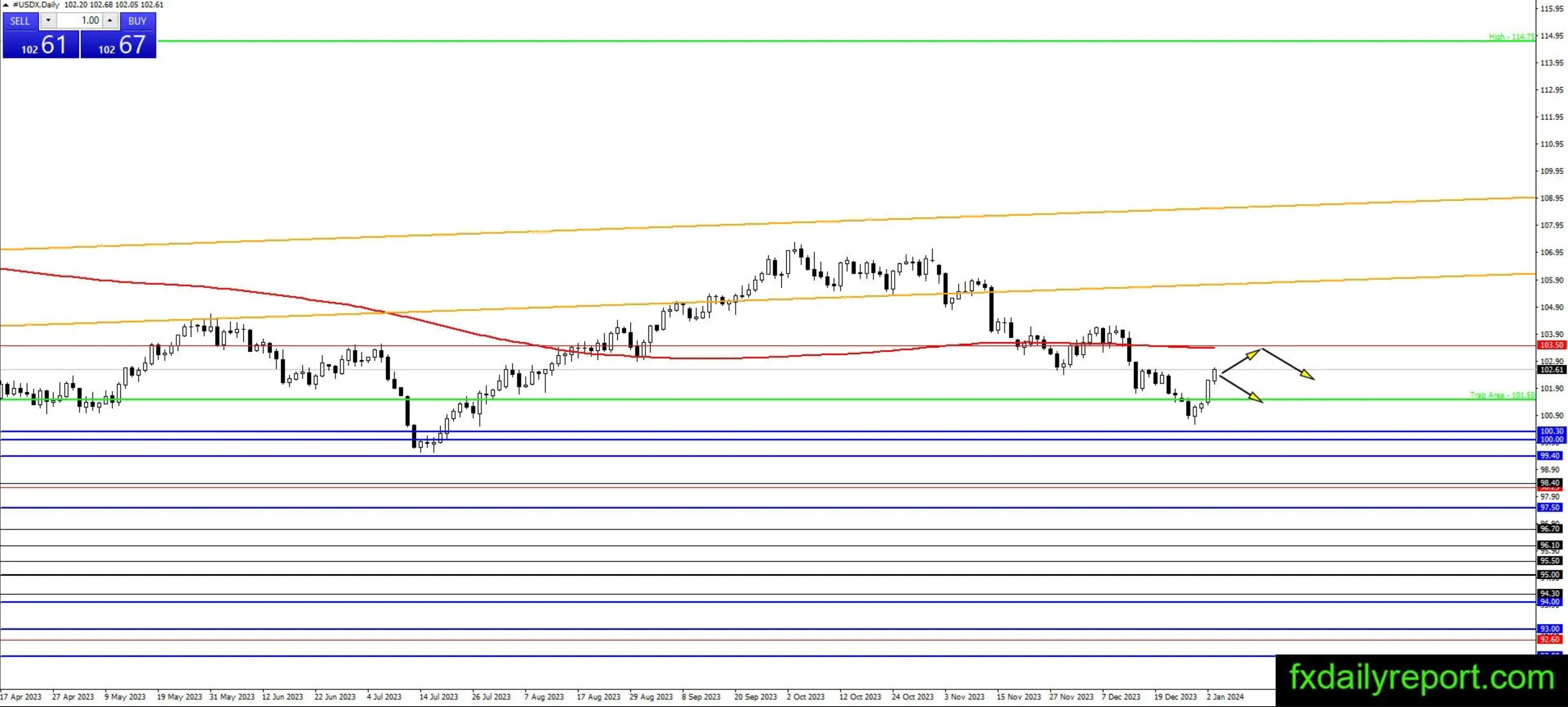 美元指数反转上行,但未触及100.00 - 100.30区间。目前,美元指数的走势是看涨的,目标为200日移动平均线。之前的下跌未能形成较低的波动低点,因此交易者现在将观察该指数的看涨走势。只要指数没有形成更高的摆动高点,运动方向仍然会看跌。如果形成更高的波动高点,那么情况可能会暂时变得中性。