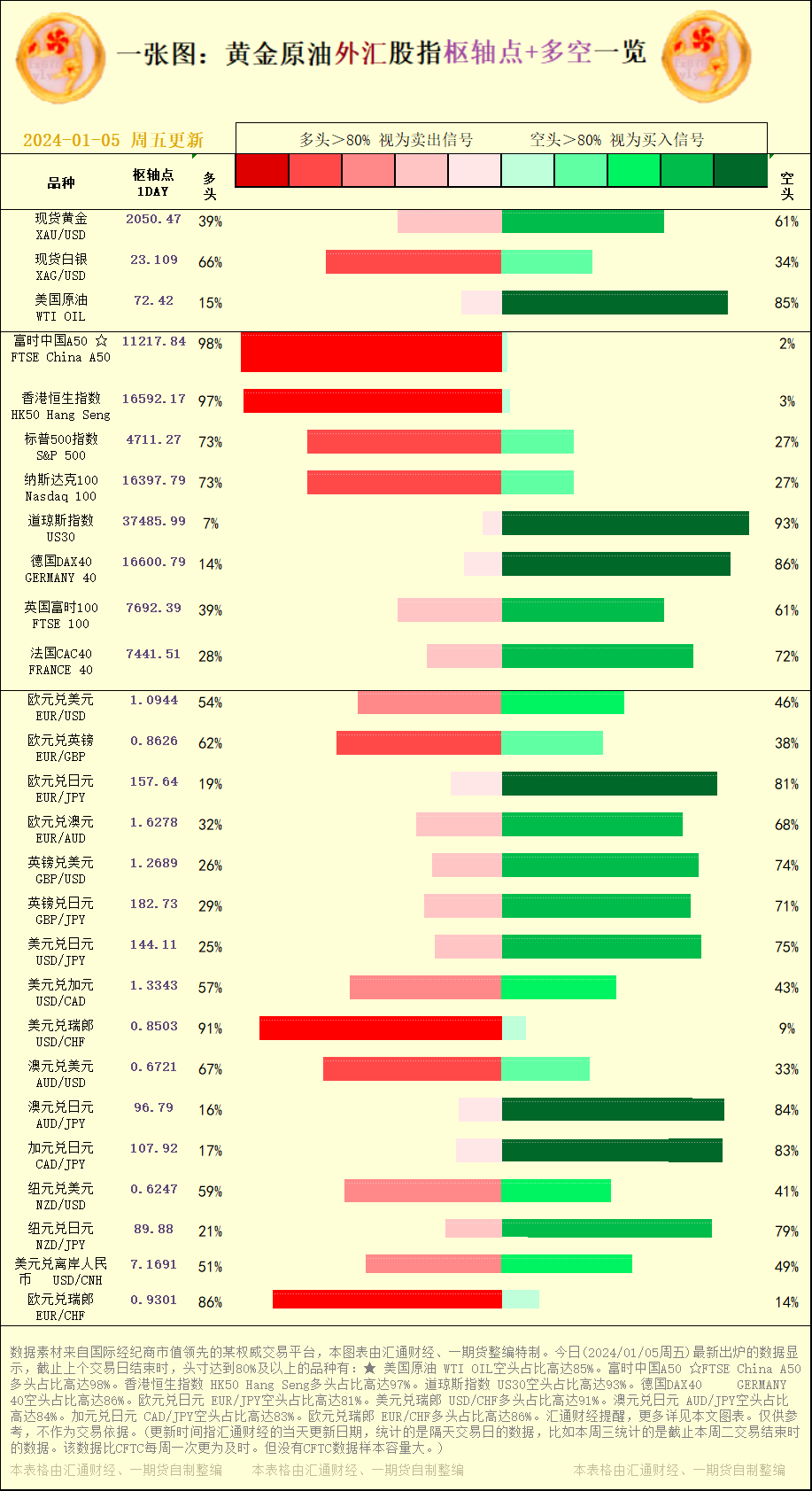 标题:一张图:2024/01/05黄金原油外汇股指"枢纽点+多空占比"一览