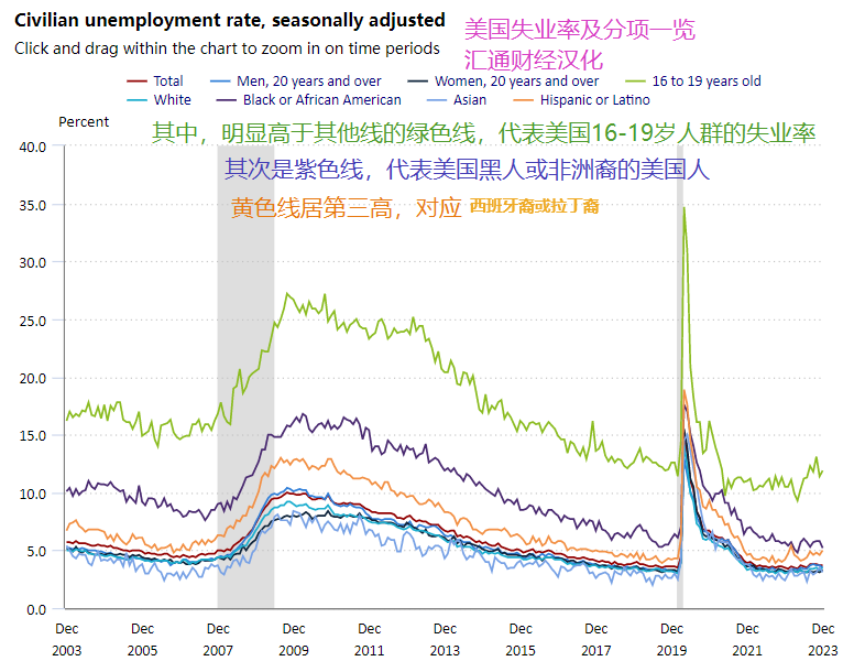 ②在主要的工人群体中,成年男性的失业率(3.5%),成年女性(3.3%)、青少年(11.9%)、白人(3.5%)、黑人(5.2%)、亚洲人(3.1%)、西班牙人(5.0%)变化不大。