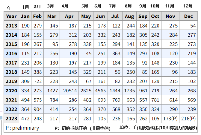 下图1是2013-2023这十一年的非农就业人数变动一览。
