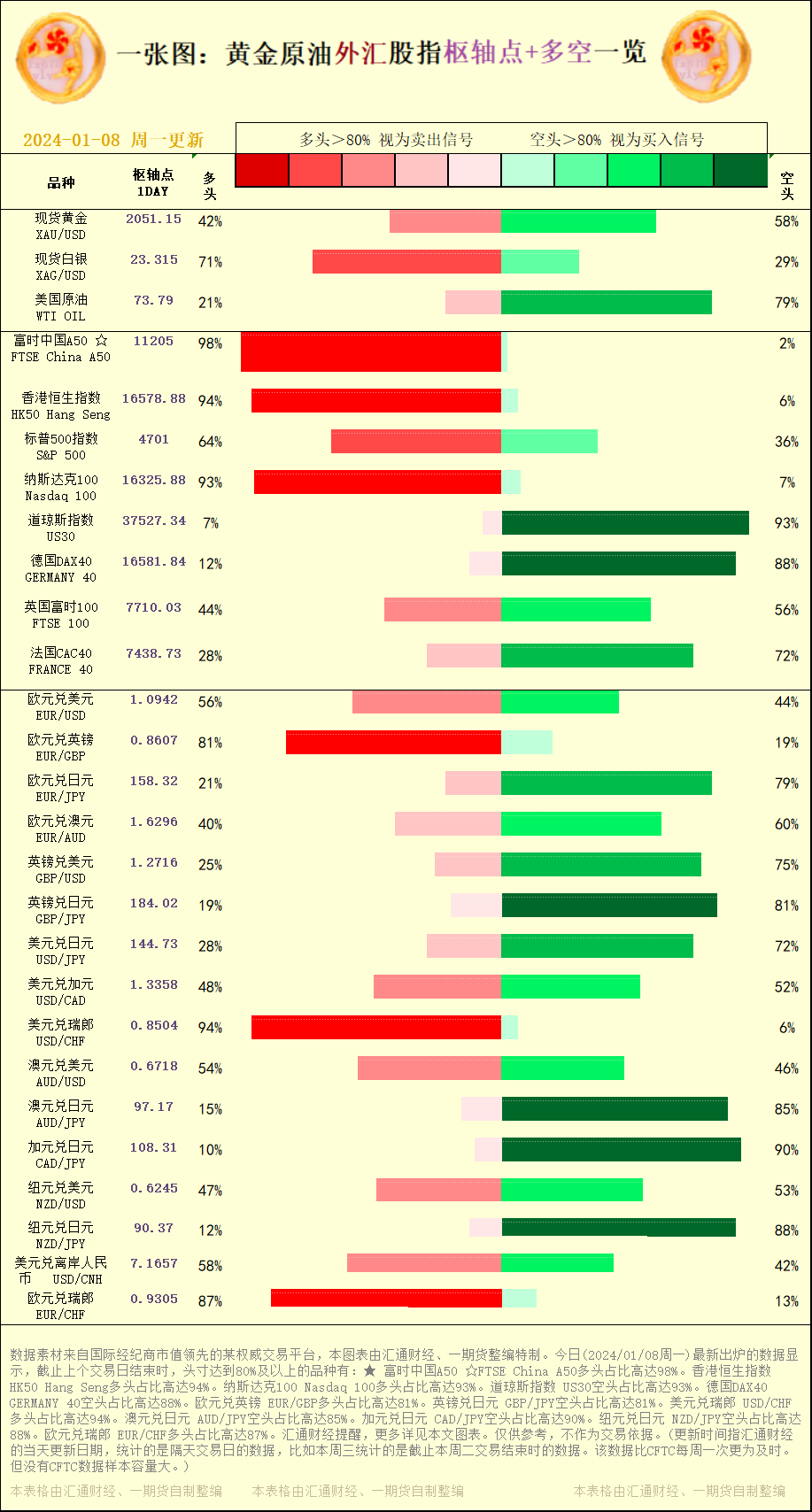 标题:一张图:2024/01/08黄金原油外汇股指"枢纽点+多空占比"一览