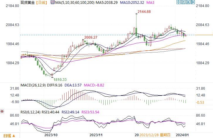 汇通财经APP讯——周一(1月8日),金价跌至三周最低,报每盎司2,028.03美元,下跌0.9%,盘初一度失守2020美元关口并触及12月18日以来最低2016.69美元。