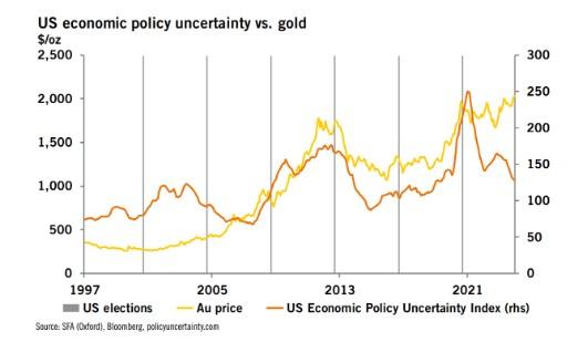 分析师们认为,随着大选的临近,围绕经济政策的不确定性可能会增加,这可能会推高金价。他们指出:“自2021年以来,金价已经偏离了衡量美国经济政策不确定性的指标,随着美国经济政策不确定性指数的下跌而上涨。”“从历史上看,随着该指数开始迅速上涨,金价也会迅速上涨。由于经济衰退风险和特朗普可能再次当选,2024年更大的不确定性可能会导致金价走高。”