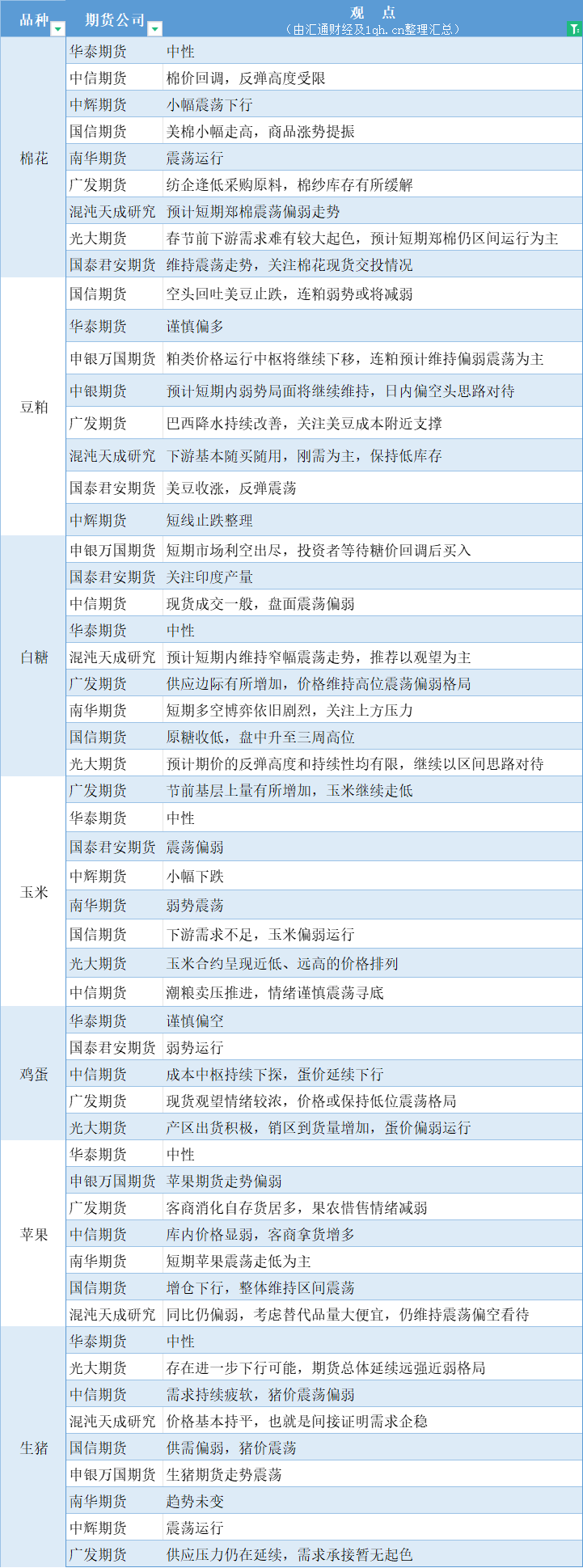 汇通财经APP讯——期货公司观点汇总一张图:1月10日农产品(棉花、豆粕、白糖、玉米、鸡蛋、生猪等)