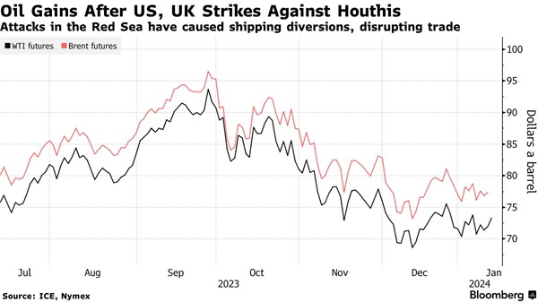 在也门胡塞武装袭击了红海的船只之后,美国和英国对该武装组织在也门的目标发动了空袭,此后油价跳涨。