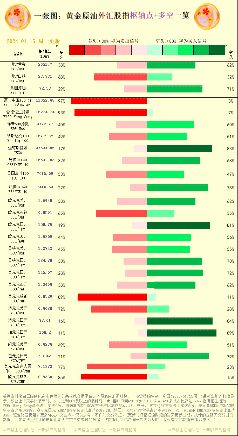 标题:一张图:2024/01/15黄金原油外汇股指"枢纽点+多空占比"一览