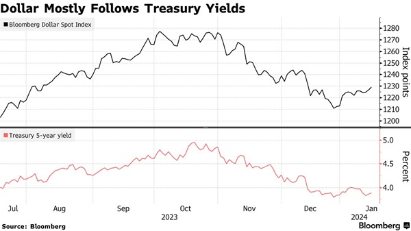 随着美国假期结束后交易恢复,美国国债收益率全面上升。投资者正在等待美联储理事沃勒(Christopher Waller)定于周二发表的讲话,此前美联储主席鲍威尔(Jerome Powell)发出迄今为止最明确的信号,即2024年将进行一系列降息。
