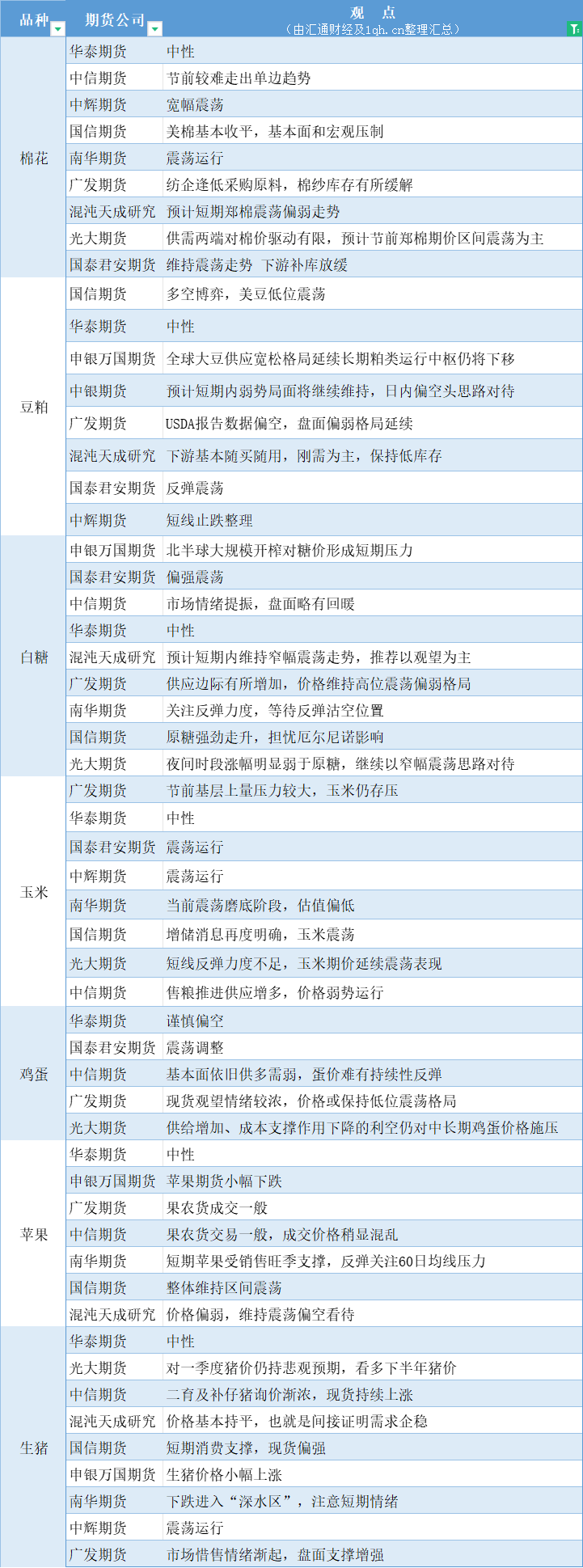汇通财经APP讯——期货公司观点汇总一张图:1月17日农产品(棉花、豆粕、白糖、玉米、鸡蛋、生猪等)