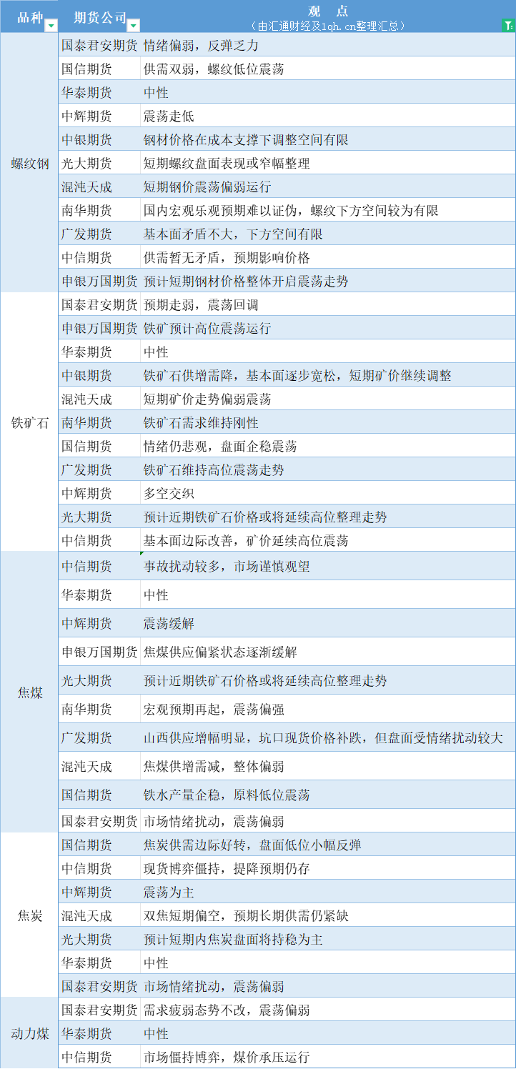 汇通财经APP讯——期货公司观点汇总一张图:1月18日黑色系(螺纹钢、焦煤、焦炭、铁矿石、动力煤等)