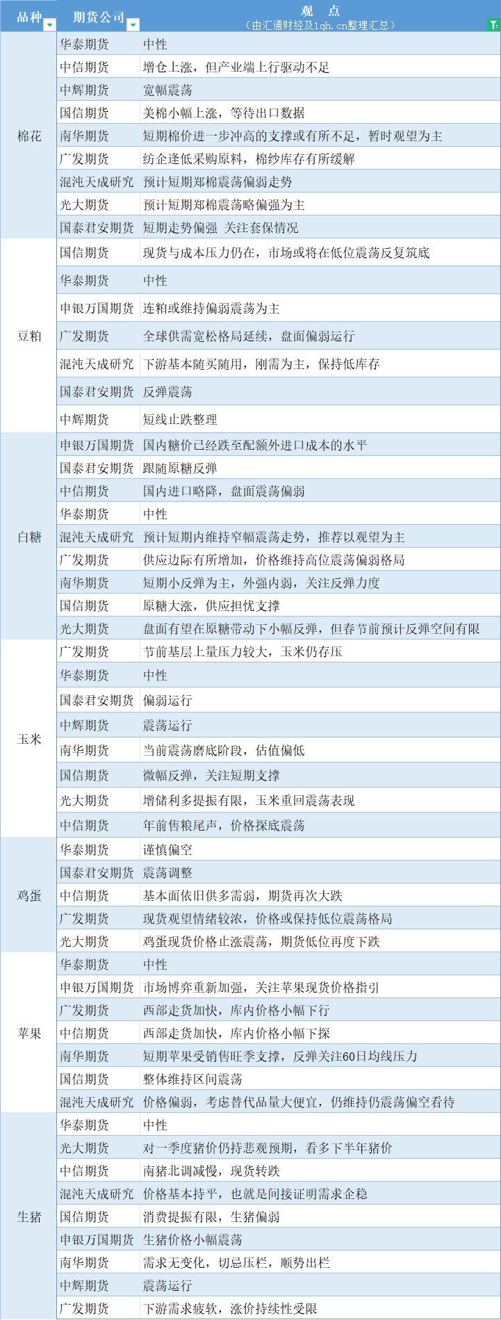 汇通财经APP讯——期货公司观点汇总一张图:1月19日农产品(棉花、豆粕、白糖、玉米、鸡蛋、生猪等)