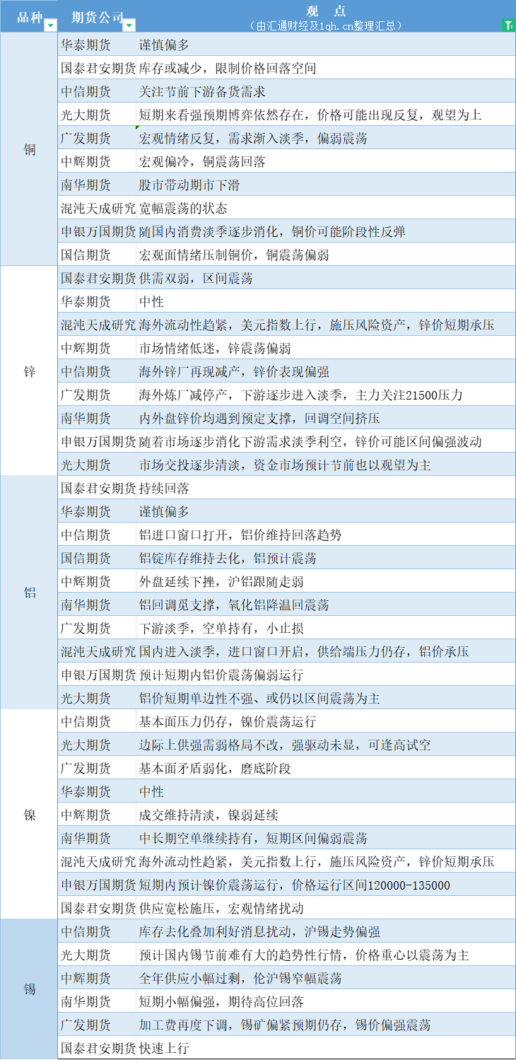 汇通财经APP讯——期货公司观点汇总一张图:1月19日有色系(铜、锌、铝、镍、锡等)