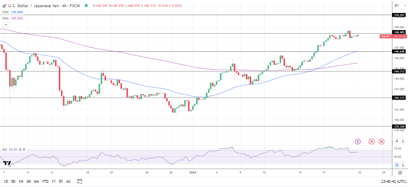 14周期4小时RSI为62.81,表明美元/日元在进入超买区域之前将回到149关口。