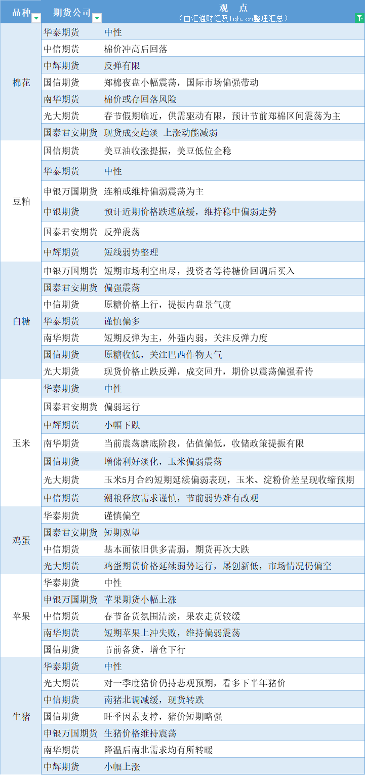 汇通财经APP讯——期货公司观点汇总一张图:1月23日农产品(棉花、豆粕、白糖、玉米、鸡蛋、生猪等)