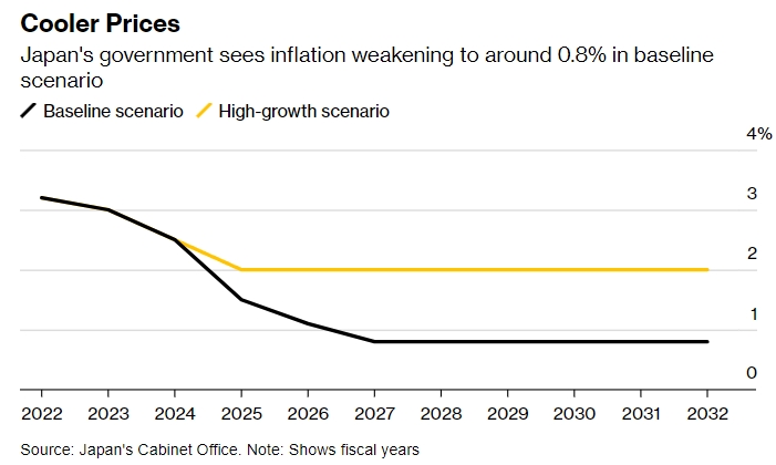 日本内阁办公室做出的其他估计,包括在基本情景下,继2024财年增长2.5%后,2025财年工资预计将增长1.7% 该国实际国内生产总值(GDP)可能在2024财年增长1.3%,在2025财年增长0.8%。