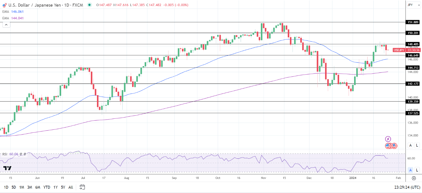 14天RSI为60.06,表明美元/日元突破148.405阻力位,然后进入超买区域。