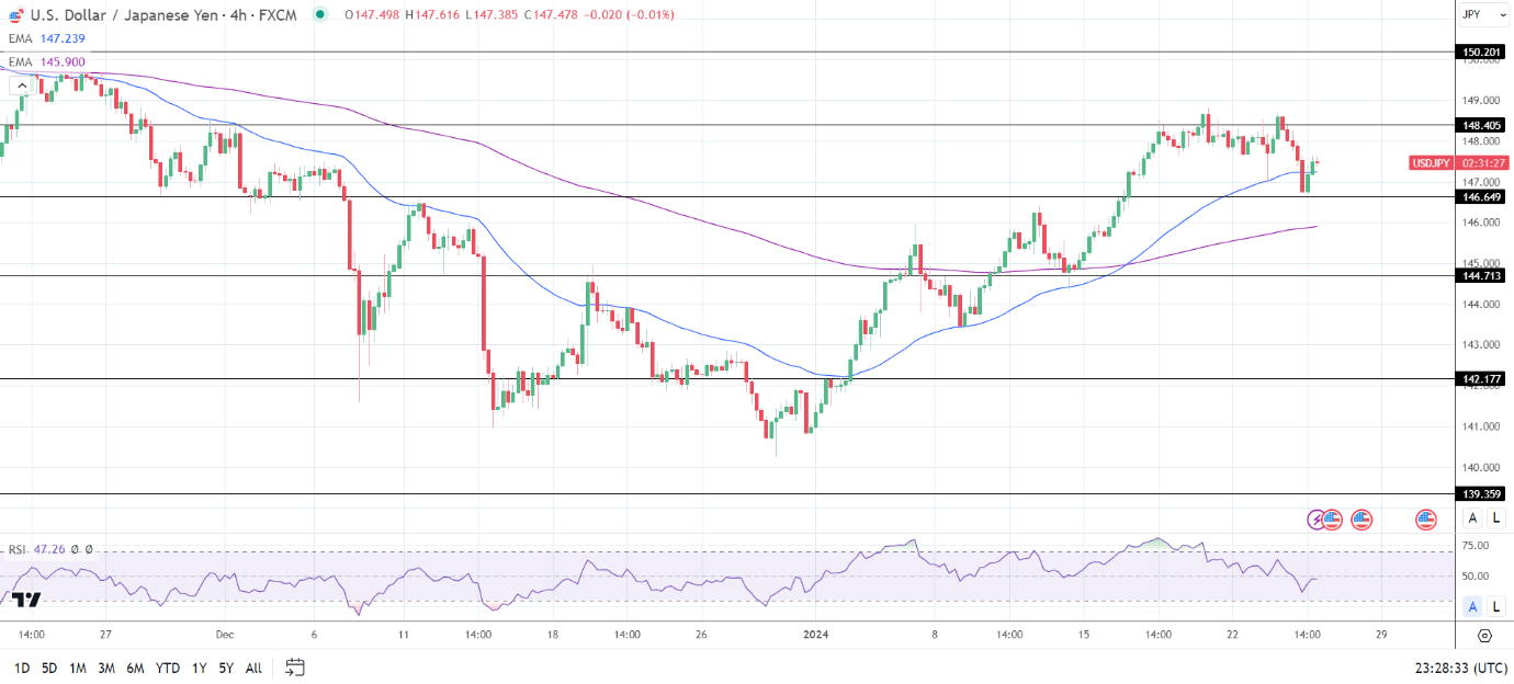14周期4小时RSI为47.26,表明美元/日元在进入超卖区域之前跌破146.649支撑位。