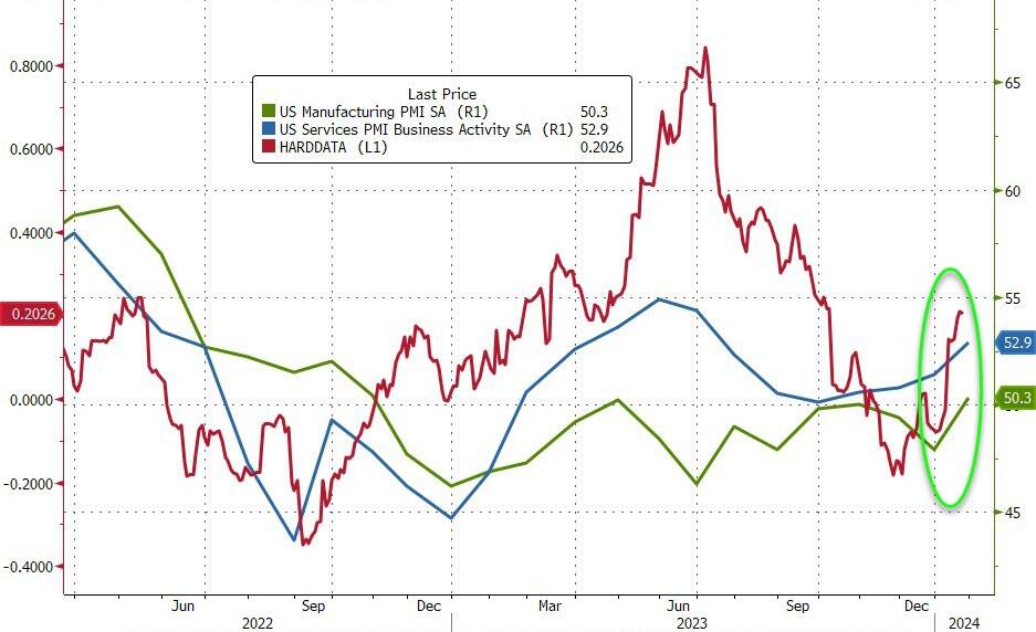 周三,根据标普全球发布的数据,美国1月Markit制造业和服务业双双超预期,较12月有所改善,创下数个月新高。美国1月Markit制造业PMI初值50.3,创2022年10月份以来新高,预期47.6,前值为47.9。美国1月Markit服务业PMI初值52.9,创七个月新高,高于预期的51.5,前值为51.4。美国1月Markit综合PMI初值52.3,高于预期的51,前值为50.9。