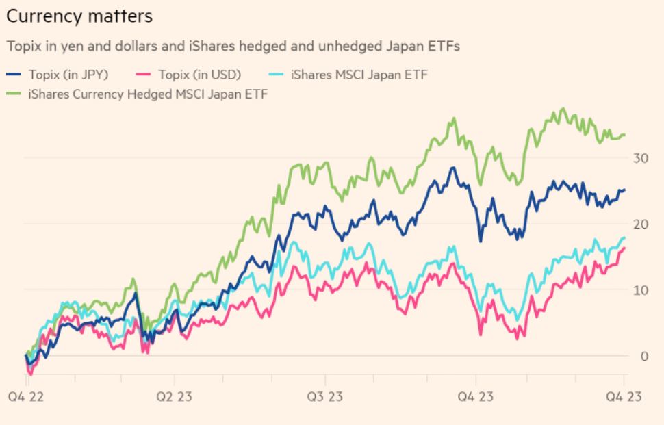 休斯指出,任何去年用非对冲美元购买日本Topix指数的人的收益的三分之一都被日元贬值所吞噬。正如上图所示,以美元计算(粉色线),Topix买家的投资增长了16%,但对于以日元计价的投资者而言增长了25%(深蓝线)。对于iShares MSCI日本ETF的持有者,差距更加明显。向对冲基金(绿色线)的持有者致以赞美。