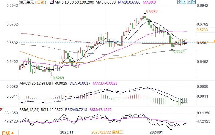 周四(1月25日),澳元兑美元基本持稳在0.6578附近,走势状态仍旧是窄幅横盘整理。虽然来自中国的降准刺激经济的消息一度稍稍提振了一下澳元,但作用有限,且在美国公布强于预期的GDP经济增长数据之后,澳元继续受到压抑。目前澳元/美元的走势颇为纠结,一方面较依赖来自中国的经济表现,一方面美联储降息时点预期延后美元走强,都困扰着澳元的走势。日线图上,澳元/美元进入窄幅横盘震荡走势,澳元挣扎守护在0.65之上,技术指标处在超卖区域,但有所钝化,下行力度显示减弱。目前投资者似乎关注的焦点还是在美联储首次降息的时点上,若显示早于夏季前降息,澳元或许能获得动能反弹,否则澳元下行的压力依然难以解除。