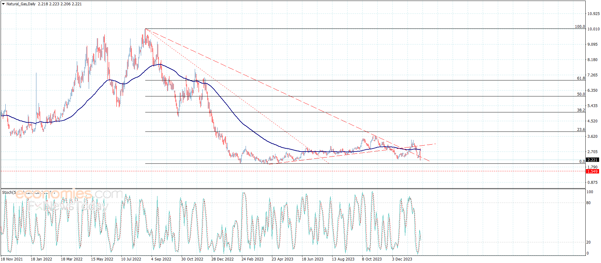近日,天然气价格测试了55日均线阻力(目前在2.820附近),结束了最后一次修正看涨反弹。昨天(周四)空头发力,价格跌至2.400支撑线下方,在2.200支撑位附近盘整。如果价格收于跌破的支撑位下方,这将进一步增加中周期内跌至1.950和1.650的可能性。