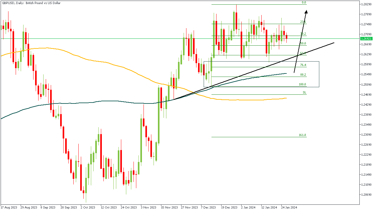 欧元兑美元目前位于支撑趋势线和76%斐波那契回撤位上。200日移动均线作为支撑存在,88%斐波那契回撤位正好位于跌平涨形态(Drop-Base-Rally)需求区上方,这就得出了支持看涨结果的结论。