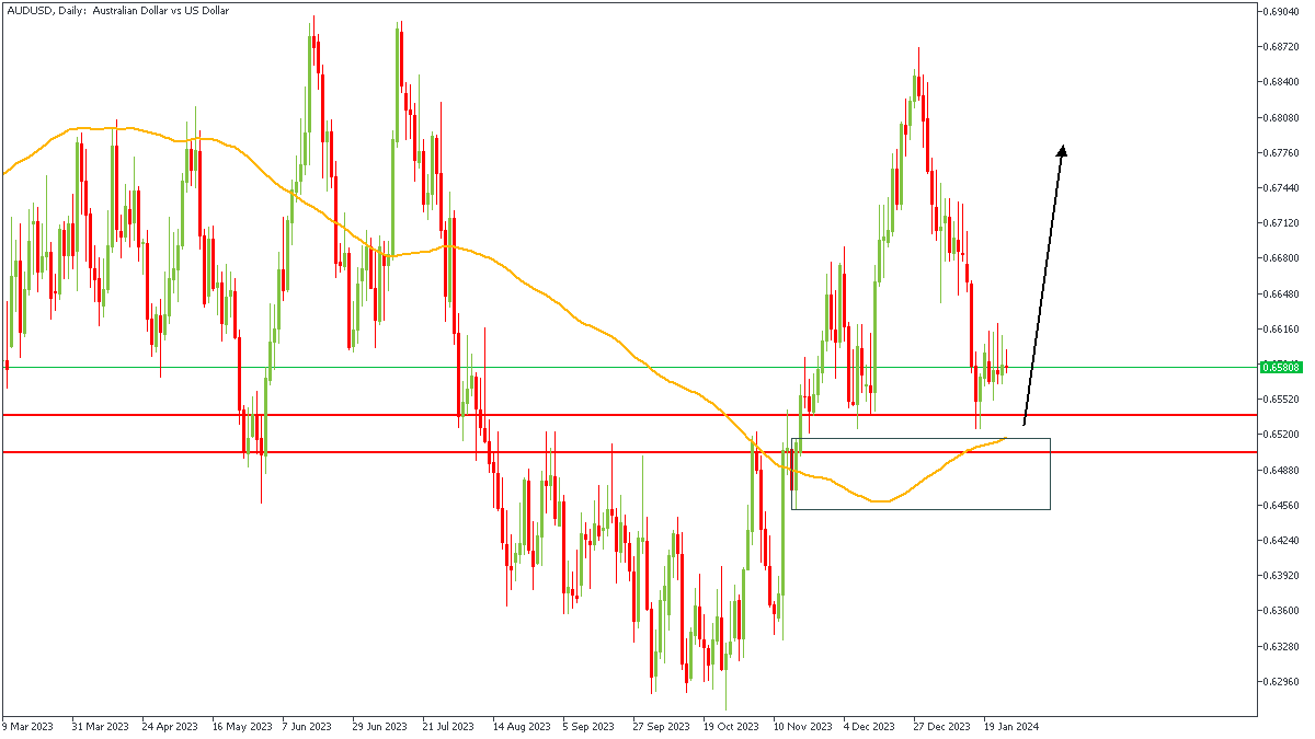 澳元兑美元连续几天迅速下跌,目前可以看到正在盘整;这种价格走势通常预示着看跌冲动的消退,为新的买入压力创造了空间。此外,涨平涨形态需求区、支点区和200日移动均线似乎都支持该区域的看涨反应。