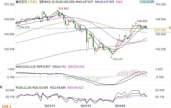 北京时间1月30日11:19 美元兑日元 报 147.42/43。