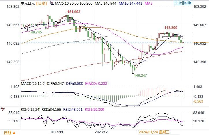 周四(2月1日),美元指数尾盘下跌0.55%,报103.04,美元兑日元下跌0.45%,收盘报146.29。美联储主席鲍威尔周三在利率会议之后表示,利率已经见顶,将会在未来几个月降息。美国通胀继续下降,预计就业和经济将会持续增长。但他拒绝宣布持续两年的抗通胀行动已经取得胜利,也没有确认已经实现了联储追求的经济“软着陆”,更没有承诺最快将在3月19-20日的会议上降息。即便如此,根据芝商所的FedWatch工具,交易商目前预计3月降息的可能性为39%,5月降息的可能性为94%。此外,周四银行股继续遭抛售,延续了前一天的跌势,因当日纽约社区银行NYCB.N报告其商业房地产投资组合出现亏损。金融业的因高成本所带来的风险性担忧也可能提振了避险日元。而消息面传出日本央行1月表明鹰派倾向,就退出刺激政策展开讨论,也对日元构成支撑。日内关注美国非农数据情况,若就业市场也开始松缓,势必加强美联储5月降息的押注,如此日元则存在着极大的回升可能性。日线图上,美元/日元开始落于布林带中轨线之下,MACD形成死叉,显示美元回落走势变得明显。下方继续留意近期的初步支撑146是否能破位,若下破,下方跌幅将会加深。