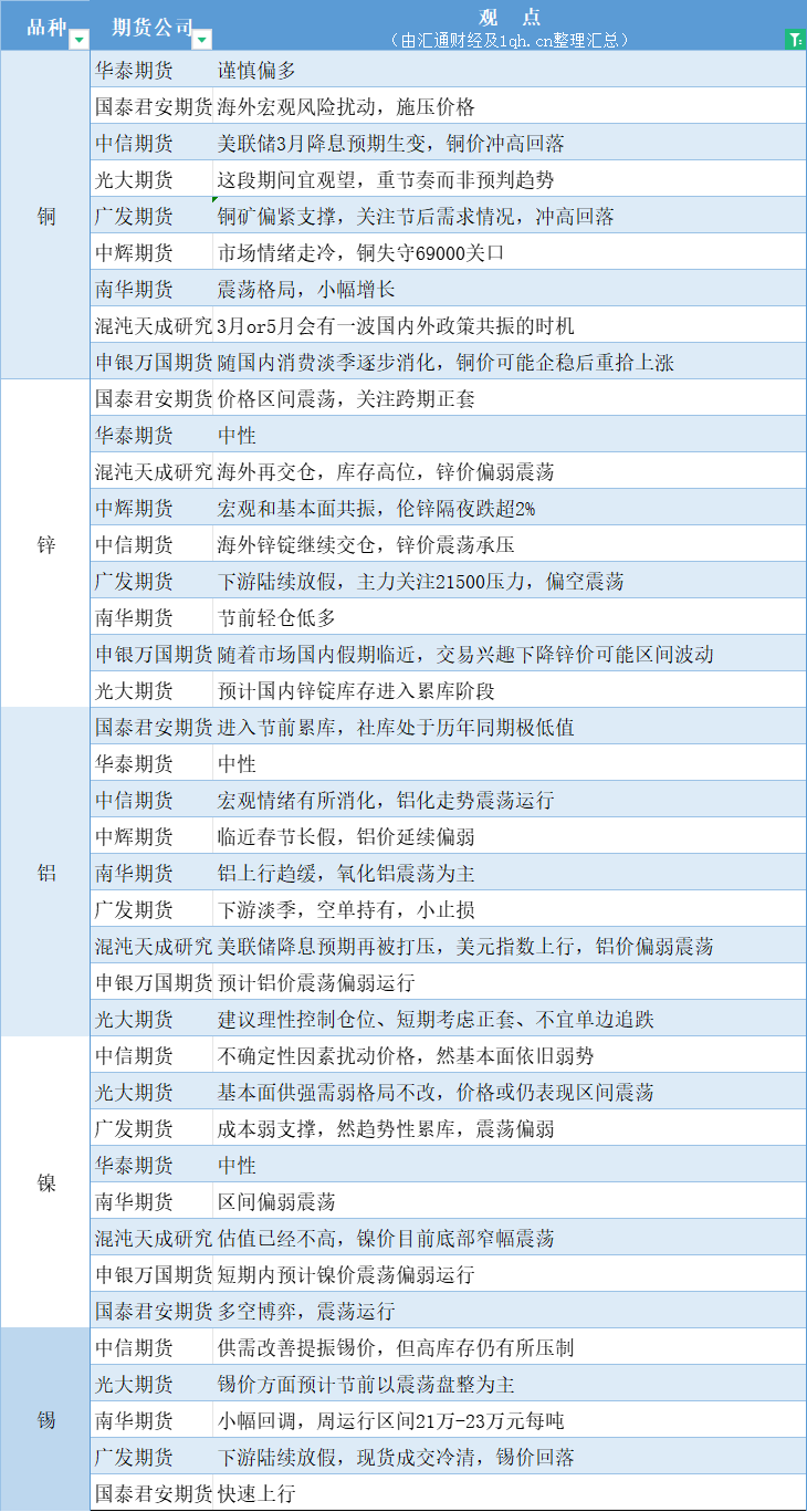 汇通财经APP讯——期货公司观点汇总一张图:2月2日有色系(铜、锌、铝、镍、锡等)