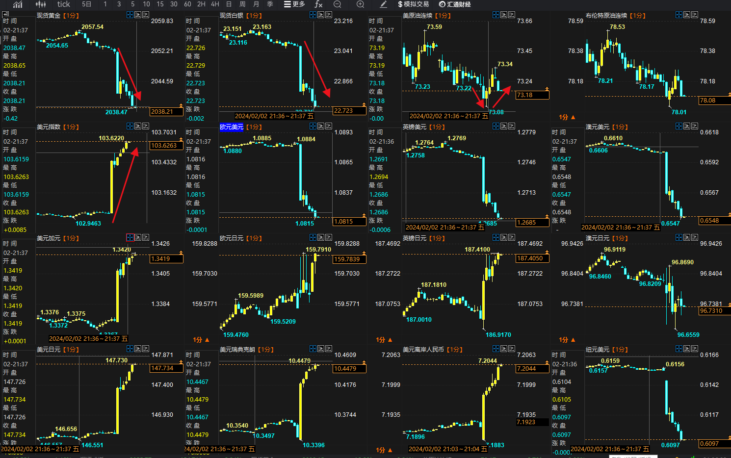 短线市场反应强烈,1分钟内,黄金及非美货币全线大跌,美国1月非农意外大增35.3万,美元指数1分钟暴涨逾50点至103.45上方,黄金1分钟跌11美元至2040,白银1分钟暴跌近0.3美元至22.789。不过美国原油基本没有出现卖压,目前仍是窄幅震荡行情,因一方面美元走强压制油价报价,但同时美国强劲经济利好原油需求,支撑油价。其后黄金及非美货币有扩大跌幅,原油则扩大震荡区间。
