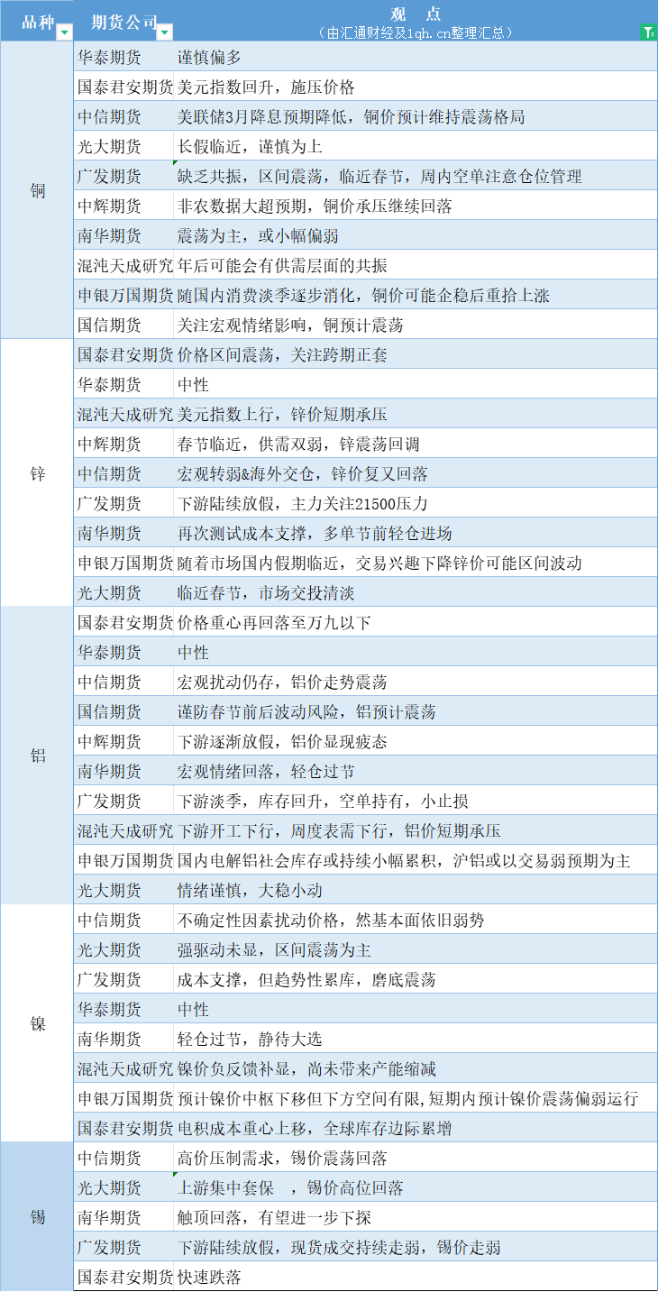 汇通财经APP讯——期货公司观点汇总一张图:2月5日有色系(铜、锌、铝、镍、锡等)